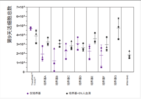 与各种商业培养基相比,TheraPEAK T-VIVOTM培养基在透气细胞扩增 装置中支持有效的T细胞扩增。所有培养基均补充有重组人IL-2(100 IU/mL)。不同供体采用▲■●符号表示。为了进行比较,还向每种培养基 中添加了人AB血清(5%)(黑色符号)。培养基G和RPMI-1640在不补充人 AB血清的情况下不支持T细胞生长。