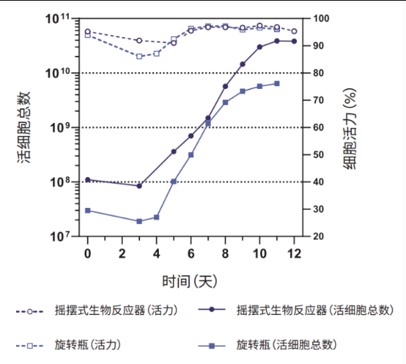 使用TheraPEAK T-VIVO培养基在摇摆式生物反应器和旋 转瓶中扩大规模T细胞扩增。