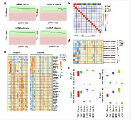 b)基于皮尔逊相关系数的mRNA血浆样本的分层聚类,显示了EAC样本与HGD和NDB样本的聚类;