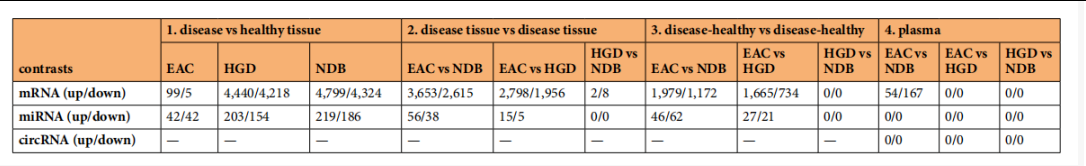 对组织和血浆中的mRNA、miRNA和环状RNA进行了同源基因表达和丰度分析。不同表达基因的数量见表1。预处理后的数据也被上传到R2 Genomics Analysis and Visualization Platform 中(http://r2.amc.nl),可对数据集的进一步探索和可视化。在本研究中,我们在EAC、HGD和NDB患者的血浆中鉴定了几种环状RNA,它们的环状结构更能抵抗外切酶的RNA降解,因此这种类型的RNA作为循环生物标记物具有很大的潜力。虽然我们关注使用小RNA测序数据进行miRNA表达和丰度分析,但其他小RNA如tRNA(片段)和piRNA也可以使用我们的数据进行分析。
