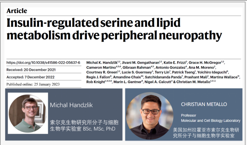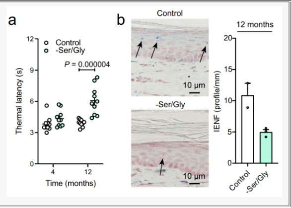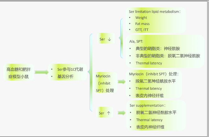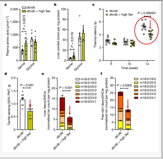 低系统性丝氨酸和甘氨酸也成为黄斑和周围神经疾病的标志,与视力受损和周围神经病变相关。在这篇文章中作者证明了异常的丝氨酸稳态驱动糖尿病小鼠的丝氨酸和甘氨酸缺乏,并通过量化丝氨酸摄取和处理的丝氨酸耐受试验进行了诊断。通过限制饮食中的丝氨酸或甘氨酸以及高脂肪摄入来模拟年轻小鼠的这些代谢改变,可以显著加速小纤维神经病变的发生,同时减少脂肪。通过膳食补充丝氨酸的正常化和用肉豆蔻素缓解血脂异常都可以缓解糖尿病小鼠的神经病变,将丝氨酸相关的周围神经病变与鞘脂代谢联系起来。
