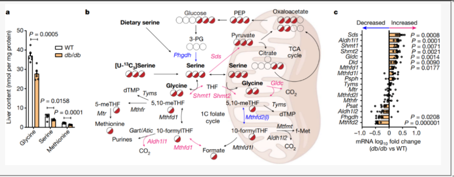 为了探索肥胖和糖尿病如何影响丝氨酸,甘氨酸和一碳(SGOC)代谢,作者在病态肥胖,胰岛素耐受和高血糖的小鼠模型(瘦素受体缺陷的db/db小鼠,黑色Kaliss背景(BKS-db/db))中定量检测了组织中的丝氨酸,甘氨酸和蛋氨酸,并与年龄匹配的野生型对照的结果进行了比较。