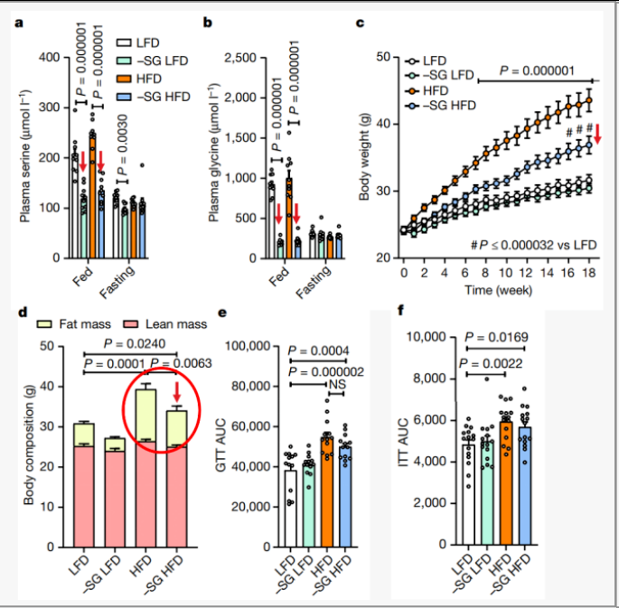c:丝氨酸和甘氨酸限制HFD饮食,可使体重显著降低;