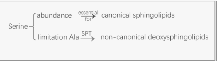 为了使大家对接下来的研究有更好的理解,这里做一些背景介绍:在丝氨酸丰富的情况下,可以促进典型的鞘脂类的合成,而在丝氨酸缺乏的情况下,丙氨酸会在丝氨酸棕榈酰转移酶SPT的作用下进行非典型的脱氧鞘脂类的合成(如下图)。脱氧鞘脂在结构上不同于典型的鞘脂,因为它们缺乏必需的C1-OH基团。而1-脱氧鞘脂不能转化为复杂的鞘脂,也不能通过典型分解代谢途径被降解。