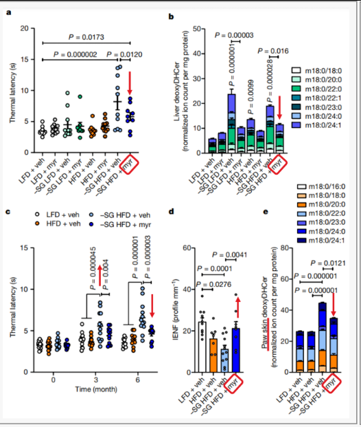 e, f:肝和爪皮肤(非典型的鞘脂类)脱氧二氢神经酰胺水平降低。