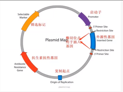1)获得所需的插入物(目的基因),目的基因可以是来自真核、原核生物的任何细胞类型的DNA或mRNA,也可以是实验室直接合成的。通过PCR、酶切等技术将基因组DNA或cDNA(通过mRNA体外逆转录合成cDNA)中分离得到一段含有目的基因的DNA序列,通过产物纯化后连接到线性化的载体上。关于载体一般常用到的是质粒载体,它是一种小型环状DNA分子—在基因工程中作为最常用,最简单的载体。与天然质粒相比,质粒载体通常带有一个或一个以上的选择性标记基因(如抗生素抗性基因)和一个人工合成的含有多个限制性内切酶识别位点的多克隆位点序列,并去掉了大部分非必需序列,使分子量尽可能减少,以便于基因工程操作。通过用相同的限制性内切酶(例如EcoRI等)切割载体DNA和外源DNA(目的基因),使切割后载体与外源DNA产生末端相容的构型。将载体和制备的目的DNA混合在DNA连接酶作用下进行连接反应,从而完成了重组DNA的构建。
