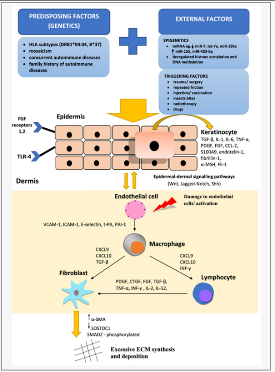 LOS(图2)的遗传因素包括HLA亚型、镶嵌现象、并发自身免疫疾病、自身免疫疾病家族史。表观遗传因素包括:microRNA、组蛋白修饰和DNA甲基化。环境因素包括:精神创伤/手术、反复摩擦、注射/疫苗、昆虫叮咬、射线、药物。角质形成细胞、T细胞活化,产生TGF-β、TNF-α、PDGF、FGF、FLI-1、ET-1、fibrillin-1、α-MSH、IL-1、IL-2、IL-4、IL-6、IL-8、IL-12、IL-13、IL-17、IFN-α、IFN-γ、S100A9。这些因子通过TLR-4导致纤维母细胞增殖。角质形成细胞通过Wnt、Sonic hedgehog和Jagged-Notch信号通路与内皮细胞、纤维母细胞相互作用。内皮细胞活化导致细胞因子和粘附分子的分泌,这些因子进而导致免疫细胞产生纤维化生长因子,刺激成纤维细胞活化、增殖和分化,造成进行性纤维化。