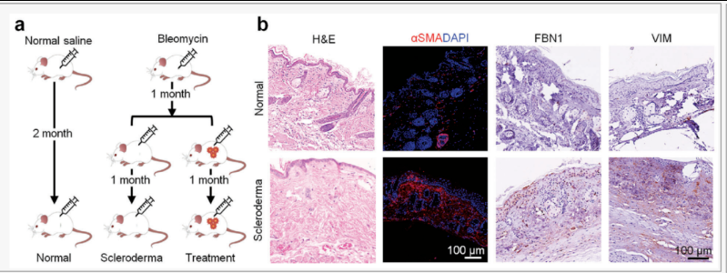 通过博莱霉素注射一个月建立了LOS小鼠模型,以模拟其病理特征(图3)。从宏观角度看,皮肤颜色较浅,局限性皮损硬化和萎缩,中心略微凹陷。组织病理学显示真皮层有广泛的坏死,真皮层的胶原束中有密集的炎症浸润物。α平滑肌肌动蛋白(αSMA)、纤维蛋白1(FBN1)和波形蛋白(VIM)在LOS皮肤的真皮层中高度表达,这些蛋白通常用于识别病理性成纤维细胞和肌成纤维细胞。