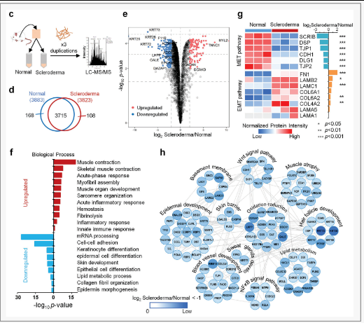接下来,用定量蛋白质组学方法来分析LOS皮肤组织的病理特征(图4)。生物学过程分析显示,上调的蛋白质高度富集于肌肉的牵引和发育、肌纤维组装和伤口愈合,包括止血、肌纤维溶解、炎症和免疫反应,表明LOS皮肤表现出肌纤维坏死和炎症浸润。