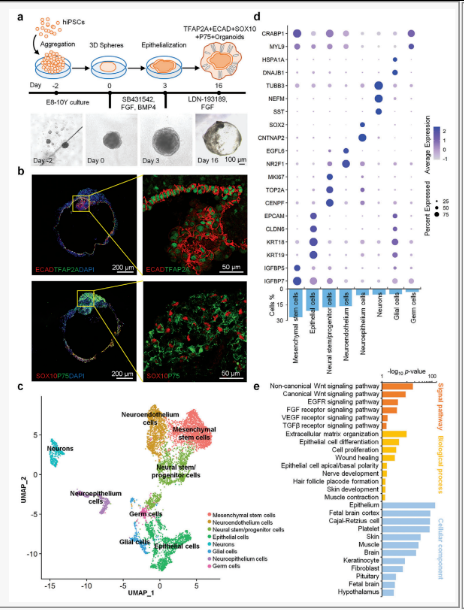 应用人类iPSCs来构建类器官(图5)。将iPSCs聚集在U型底96孔板上后,在基质胶中培养这些聚合物,并辅以骨形态发生蛋白4(BMP4)、SB431542(一种TGFβ抑制剂)和碱性成纤维细胞生长因子(FGF),经过3天的分化,用LDN-193189(一种BMP抑制剂)和FGF处理有机体,并在摇床上培养。16天后,组织体表达了外皮标志物(TFAP2A+ECAD+),此外颅骨神经嵴细胞的两个亚型出现了中胚层(PDGFα+)和神经胶质标记(SOX10+P75+)。对此类器官进行单细胞RNA测序,包括8种细胞类型:间充质干细胞、上皮细胞、神经干/祖细胞、神经内皮细胞、神经上皮细胞、神经元、胶质细胞和胚细胞。
