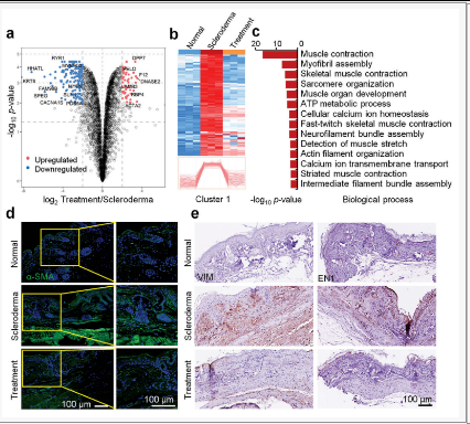 LOS模型小鼠被移植到类器官一个月,对皮肤进行蛋白质组学分析(图6)。在硬皮样病组中上调的蛋白,治疗后下调。这些蛋白在肌肉收缩和发育、肌纤维装配和ATP代谢等生物过程中高度富集,表明肌肉纤维化在类器官治疗后得到有效改善。病理染色结果也显示,类器官治疗后,LOS皮肤组织中的纤维变性标志物(α-SMA、VIM、EN1)表达明显下调,细胞因子(IL1、IL6、IL12、TNFα、CXCL12)表达明显下降。