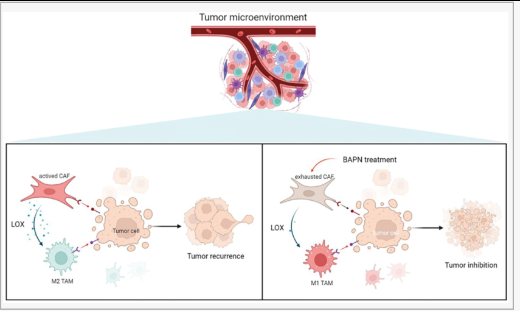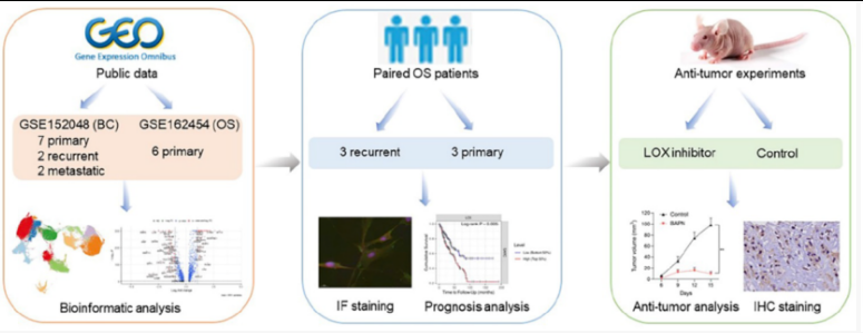 最后,作者制作了一张示意图,对本文的研究做出总结。即在复发性骨肉瘤中,CAFs浸润水平较高,在复发性OS的细胞类型中,LOX在CAFs中表达量最高,BAPN抑制LOX可调节CAFs功能,诱导巨噬细胞向促进免疫的M1类型极化,进而抑制OS。