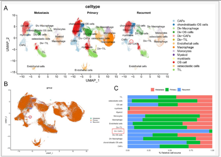经过数据分析发现,原发性、复发性和肺转移性OS病灶中鉴定出14种细胞类型(A),且三种OS病灶的t-SNE图叠加,发现复发性OS病变的Div-CAFs(diverse CAF)较突出(B)。虽然细胞种类在三种类型的OS病灶中没有大的差异,但部分比例变化非常大,尤其是肿瘤相关成纤维细胞CAF,原发性与复发性的比例为3.58%和96.42% (C),说明了复发性OS中,CAFs的浸润水平比较高。