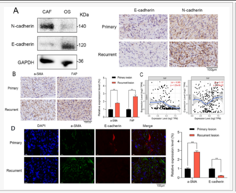 (b) CAFs激活marker:(a-SMA:recombinant stromal cell derived factor 1,FAP: fibroblast activation protein) a-SMA和FAP在复发性OS组织中显著升高(B)。