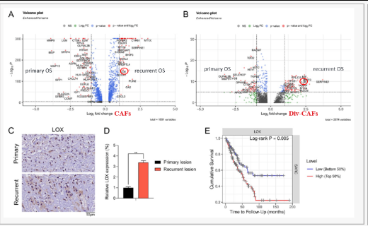 通过对CAFs和Div-CAFs细胞中差异表达的基因数据分析(A, B)及IHC实验(C, D)验证表明LOX在复发性OS组织中较原发性高,预后分析也表明LOX的高表达导致明显的预后较差(E)。