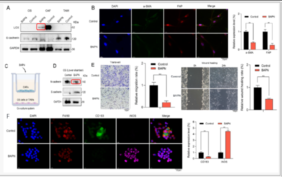 接下来,作者用LOX的抑制剂BAPN (β-氨基丙腈是一种特异性的不可逆LOX抑制剂,作用于LOX或LOXL同工酶的活性位点)进行处理,发现:CAF细胞降低,OS及TAM细胞无明显变化(A);CAF的基质激活marker a-SMA和FAP表达量降低(B);N-cadherin ( EMT 通路的marker )表达降低(C, D);OS 细胞的迁移率及伤口愈合速率均明显降低篇(E);另外检测到起促进免疫反应的M1类型的巨噬细胞(INOS)明显升高而抑制免疫反应的M2型巨噬细胞(CD163)降低(F)。