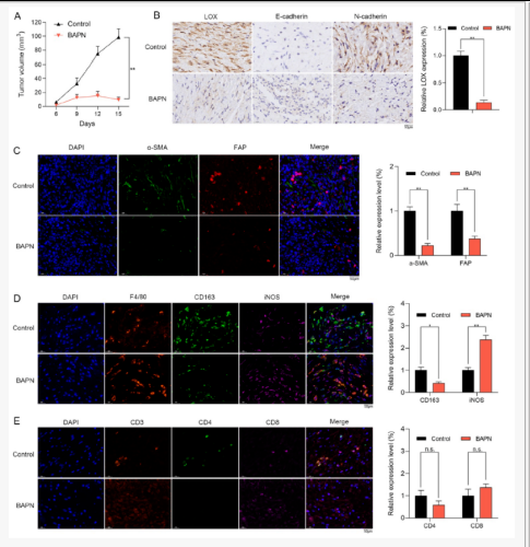 接下来在体内验证LOX的作用,对肿瘤进行异种移植,经BAPN处理后,检测到肿瘤体积降低, LOX表达水平降低(A,B);CAF的基质激活marker a-SMA和FAP表达量也降低(C);同样的与体外检测结果一致,M1类型的巨噬细胞明显升高而M2型巨噬细胞降低(D);最后,CD8细胞有所升高但不明显(E)。