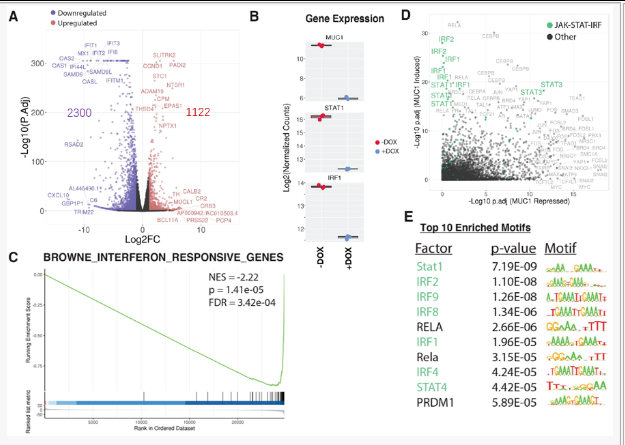 对BT-549 TNBC细胞的整体转录谱分析表明,诱导MUC1-C沉默可导致基因表达的广泛变化,约有2300个基因的表达产生了下调,1100多个基因的表达有所上调(A)。进一步分析发现沉默MUC1-C会导致(1)STAT1和IRF1(B)以及(2) IFN通路反应基因的下调(C),与MUC1-C诱导的表达模式相关的主要调控因子包括STAT1和IRF1,证实MUC1-C通过STAT-IRF转录因子活性介导信号传导(D)。Motif评估进一步验证了MUC1-C诱导的差异表达基因在STAT和IRF Motif中高度富集(E)。总之,这些发现表明STAT-IRF因子是MUC1-C诱导的TNBC细胞转录应答的主要驱动因素。