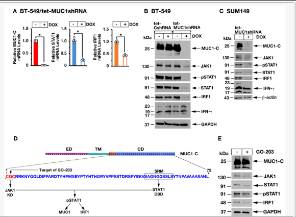 接下来,在BT-549和SUM149细胞中降低MUC1-C基因的表达,发现STAT1和IRF1基因在mRNA及蛋白水平的表达均有所降低(A-C)。通过对MUC1-C基因的蛋白序列分析,发现MUC1-C包含分别结合JAK1和IRF1的两个motif,JAK1作为激酶,当MUC1-C结合两种蛋白时,便会对STAT1进行磷酸化,因此在前面的实验结果中,由于MUC1-C基因的下调,磷酸化的pSTAT1蛋白也降低(A-C)。接下来,通过用MUC1-C的抑制剂GO-203抑制MUC1-C的表达,同样检测到了JAK1,STAT1,pSTAT1, 及IRF1蛋白表达的下调,再次验证了之前的结果。