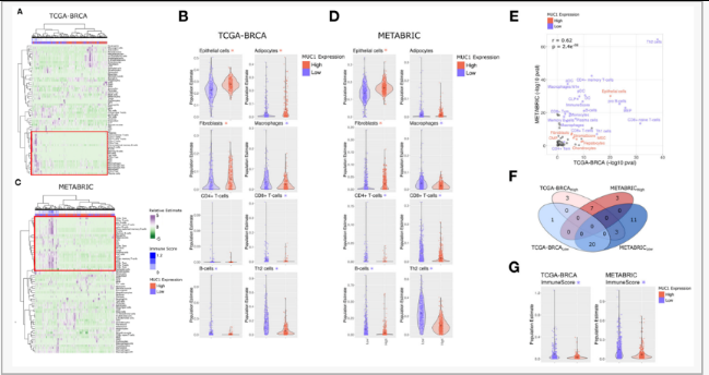 接下来,为了检测MUC1-C对免疫细胞浸润的影响,作者对两种RNA-seq数据TCGA-BRCA cohort(A)及METABRIC cohort (B)进行了分析,结果显示,相对于MUC1-C表达低的肿瘤,MUC1-C表达高的肿瘤中的免疫细胞浸润明显减少,特别是CD8+ T细胞、CD8+naive T细胞、B细胞和Th2细胞等(C, D)。在MUC1-C表达低和MUC1-C表达高的情况下,细胞类型富集的总体模式在TCGA-BRCA和METABRIC队列中显著相关(E, F)。此外,在两个数据中,基于所有免疫细胞类型估计的总免疫活性的定量在MUC1-C表达高的情况下显著降低(G)。