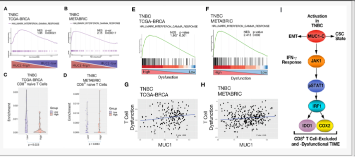 结合实验结果及通过对TNBC肿瘤中TCGA-BRCA和METABRIC数据分析,发现MUC1与IFN-γ通路的激活有关(A, B);MUC1-C的表达与CD8+ naive T细胞的耗竭显著相关(C, D);IFN-γ通路在t细胞功能紊乱的TNBCs中高度富集(E, F);此外还发现MUC1-C在两种TNBC数据集中都与T-cell功能障碍显著相关,这表明MUC1-C诱导的IFN-γ通路激活导致CD8+ T细胞排斥和功能障碍。