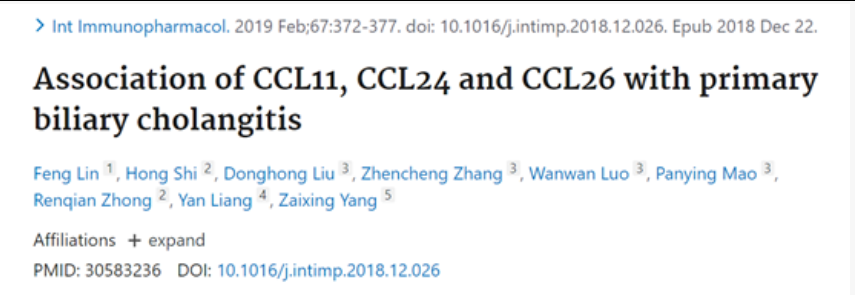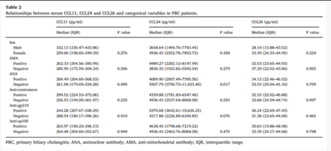 原发性胆道胆管炎(PBC)是一种原因不明的慢性自身免疫性肝病,以肝内胆管的炎症破坏为特征,该疾病可能发展为肝硬化,肝功能衰竭甚至肝癌。目前缺少识别PBC严重性和进展的相关标志物,大量研究表明CCL11、CCL24和CCL26是嗜酸性粒细胞的强效趋化因子,所以本研究招募了108名PBC患者、52名慢性乙型肝炎(CHB)患者和50名健康对照(HC),采用多重免疫法检测血清中相关因子:CCL11、CCL24和CCL26的表达,探究其与PBC的相关性。