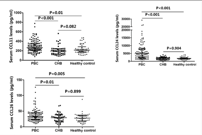 本研究是应用了由LabEx提供的MSD电化学发光多因子检测技术检测了PBC患者、慢性乙型肝炎(CHB)患者和50名健康对照血清中CCL11, CCL24 and CCL26的表达量。多因子检测作为高效的检测手段,被广泛应用在神经疾病研究中,LabEx可以提供包括MSD、Luminex、CBA以及抗体芯片在内的多因子检测服务。PBC患者血清三种因子表达量分别平均是264.48 pg/mL,4799.22 pg/ml,32.68 pg/ml都高于CHB患者和正常对照。