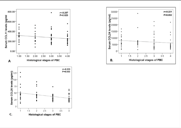 PBC组织学上分为四期:I期:为门管区炎伴有胆小管肉芽肿性破坏;Ⅱ期:为门静脉周围炎伴胆管增生;Ⅲ期:可见纤维间隔和桥接坏死形成;IV期:为肝硬化期。组织学是PBC重要的评价标准,本研究进一步分析了CCL11、CCL24、CCL26与组织学评分的相关性,结果表明血清CCL11和CCL26与PBC的组织学分期呈统计学负相关,血清CCL24无统计学相关性。