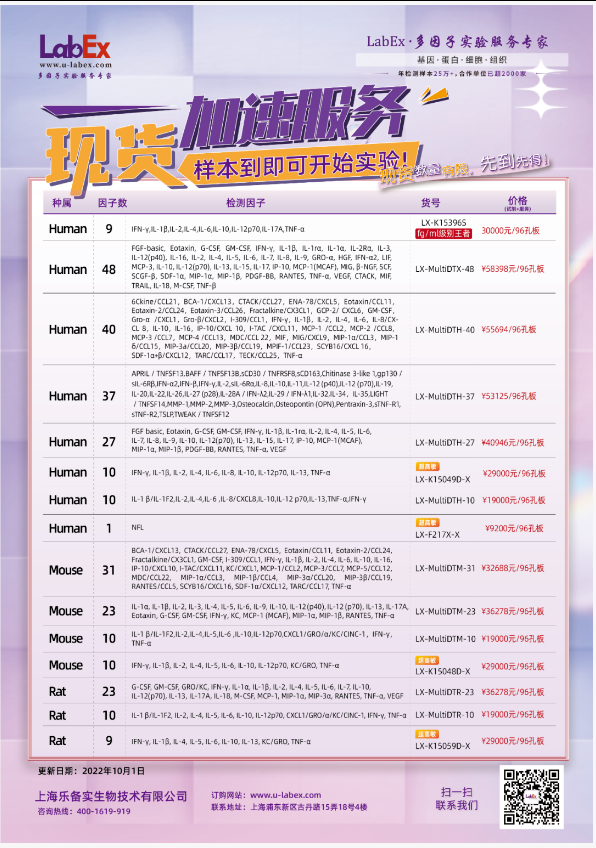LabEx 紧跟全球蛋白检测技术前进步伐,与多个前沿平台紧密合作,不断发掘蛋白质定量检测技术的灵敏度和多重分析检测极限,始终致力于为您的研究需要,提供最好的免疫分析技术与产品。现有全面包含蛋白、基因、细胞、组织水平的 PCR Array、ELISA、MSD、Luminex、CBA、抗体芯片、流式、免疫组化等多个技术平台。通过线下和线上的方式为超过2000家客户提供服务,年检测样本超25万!