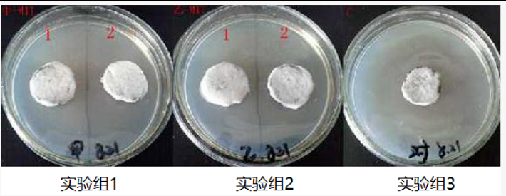 接种 106 cfu/mL的霉菌至霉菌培养基上,待菌长满后,实验组1、2分别喷洒水浴锅抑菌剂(abs9371)、培养箱除菌剂(abs9372)、细胞房除菌剂(abs9373)、水盘抑菌剂(abs9374),实验组3喷洒无菌水。
