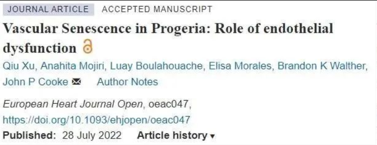 早衰综合征(Hutchinson-Gilford progeria syndrome (HGPS))是一种过早衰老引起的疾病由于LMNA基因突变导致一种不可逆的纤层蛋白A蛋白: Progerin。Progerin影响一系列细胞功能,基因表达,异染色质,组织、DNA修复和核结构。冠状动脉和动脉闭塞性疾病是HGPS患者死亡的主要原因。先前的科学研究主要集中在血管平滑肌细胞功能缺陷在早衰中的作用,本文发现内皮细胞在早衰中也发挥中重要作用,为科研研究提供了新的思路。