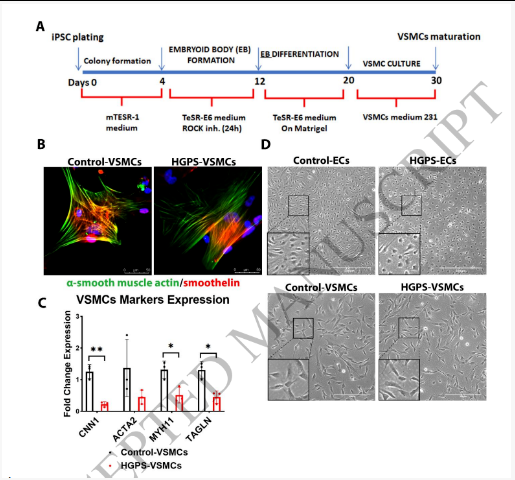 ②血管平滑肌细胞在第30天获得,检测标志物:CNN1, ACTA2, MYH11, and TAGLN;