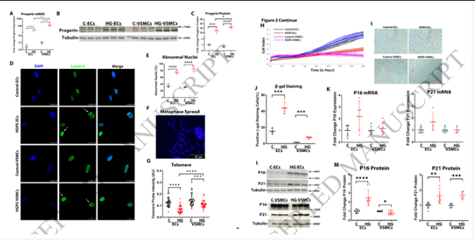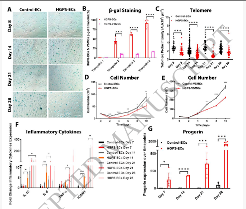 结果提示:HGPS-ECs的衰老、端粒侵蚀和β-gal染色明显大于HGPS-VSMCs。