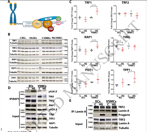 ②在HGPS-ECs和HGPS-VSMCs中,TIN2通过TRF2与RAP1结合降低;