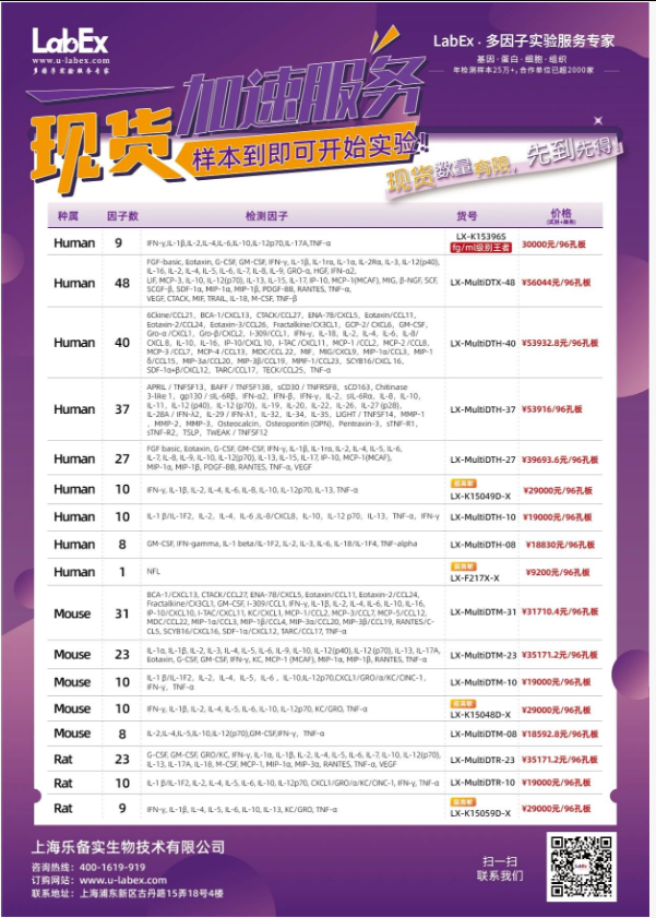 LabEx作为多因子实验服务专家,可以提供伯乐的Bio-plex等多因子检测服务,速度快,质量高,服务更专业。LabEx每年检测25万+多因子样本,并可提供专业的生物信息学分析,以帮助用户获得更高质量的检出数据和服务体验。此外,LabEx还可以提供以下服务平台: