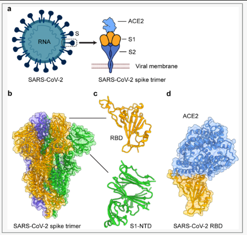 图1. SARS-CoV-2刺突(S)的蛋白结构。a. SARS-CoV-2病毒粒子及其S蛋白示意图。E包膜,M膜,N核衣壳,血管紧张素转换酶2。b. SARS-CoV-2 S蛋白三聚体(PDB 6VXX)低温em结构。分别用橙色、绿色和蓝色三种颜色来表示这三个亚基。c. SARS-CoV-2 S受体结合域(RBD)和S1亚基n端结构域(NTD)。d. SARS-CoV-2 RBD与人ACE2复合物的晶体结构(PDB 6M0J)。人类ACE2是浅蓝色的