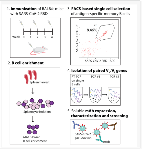 图2. 从单个B细胞中分离发现有效的SARS-CoV-2中和抗体并进行鉴定的方法综述