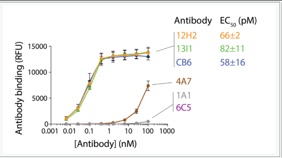 该方法使用了结合抗原沉淀法进行亲和力的分析,将链霉亲和素-磁珠与包被有生物素化RBD一起孵育后,洗涤去除掉未结合的抗体。接着使用Alexa Fluor®647荧光二抗(山羊来源,抗人IgG,Fc片段特异性亲和纯化二抗,Jackson ImmunoResearch)进行孵育并通过流式细胞术进行分析。结果显示,两个克隆体(12H2和13I1)对RBD具有较低的pM EC50值,其值与先前报道的一种有效中和抗体CB6相当(图3)。