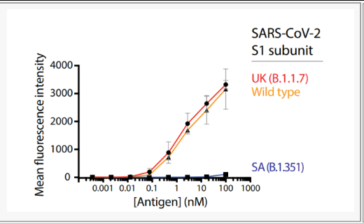 数据显示,13I1与B.1.1.7的结合保留了下来,但与B.1.351的结合基本消失,说明B.1.351这种变体的蛋白可能通过某种机制逃脱了SARS-CoV-2抗体的结合(图4)。