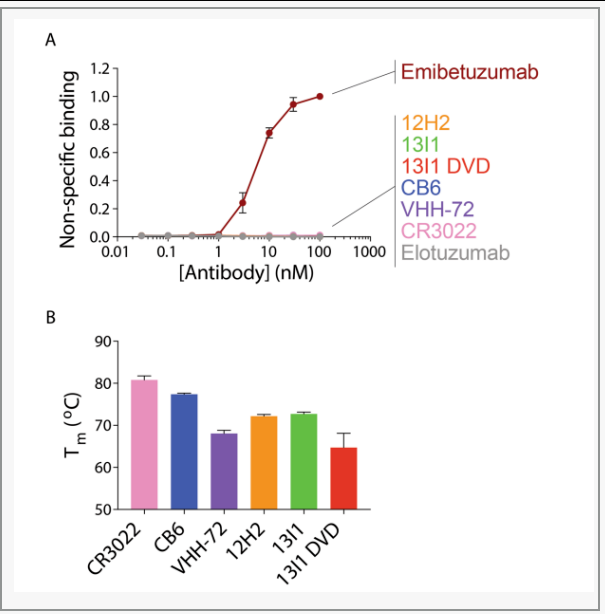 研究还显示,中和抗体具有较高的特异性和稳定性。如图5A所示,未特异性结合的抗体通过与CHO细胞中生物素化的可溶性膜蛋白孵育进行分析,并通过流式分析法来检测。两种抗体:高非特异性结合(emibetuzumab)和低非特异性结合(elotuzumab),作为对照抗体。两种对照抗体与实际药物并不完全相同,因为它们具有实际药物的可变区域和共同的IgG1框架。