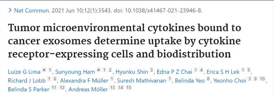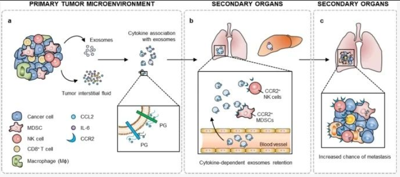 澳大利亚昆士兰大学的学者使用同系小鼠模型和癌症患者样本显示,肿瘤微环境细胞因子通过蛋白聚糖的糖胺聚糖 (GAG) 侧链与癌症衍生的外泌体结合。这些细胞因子结合的外泌体被特定组织中的细胞因子受体阳性细胞选择性吸收,导致这些次级器官的免疫景观以及外泌体生物分布发生变化,从而导致转移增加。