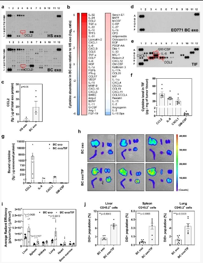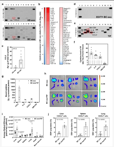 结果提示:肿瘤微环境中的细胞因子能够与癌症衍生的外泌体相关联,从而诱导远端器官免疫景观的变化,从而增加转移负担。