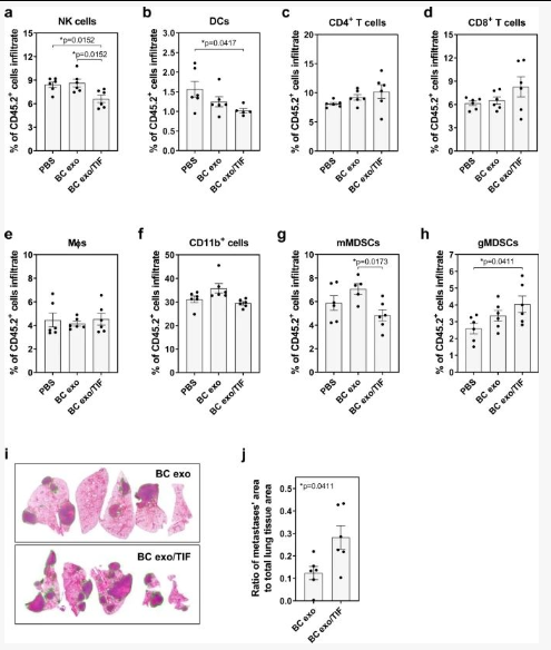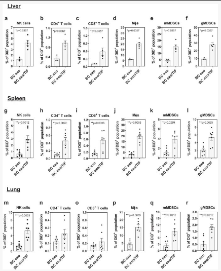 3、免疫细胞谱系,包括 NK 细胞 (CD3 − NK1.1 + )、巨噬细胞 (CD11b + F4/80 +) 和单核细胞和粒细胞髓源性抑制细胞 (mMDSCs, CD11b + Gr1 lo ; gMDSCs, CD11b + Gr1 hi ) 在肝脏、脾脏和肺中对 TIF 外泌体的外泌体摄取高于非结合外泌体;