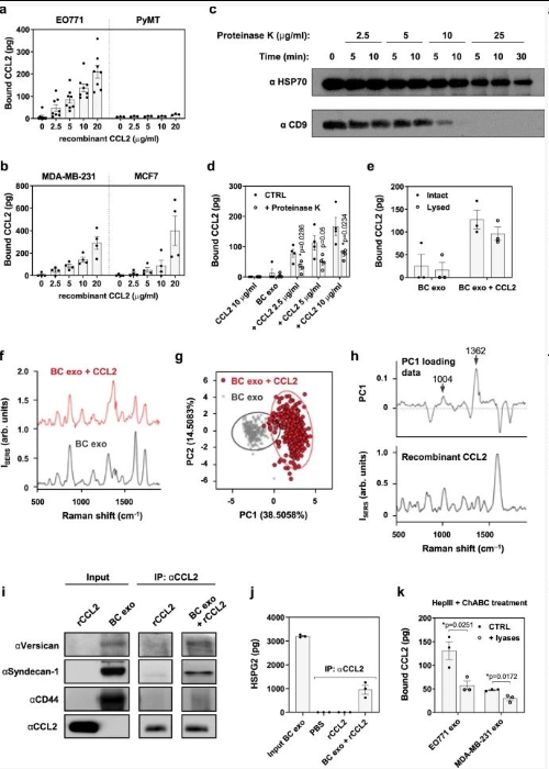 2、蛋白酶 K 处理 CCL2 结合的 BC 外泌体,其浓度会导致外膜蛋白(如 CD9)降解,但不会降解囊内 HSP70,证实破坏仅限于外泌体表面;