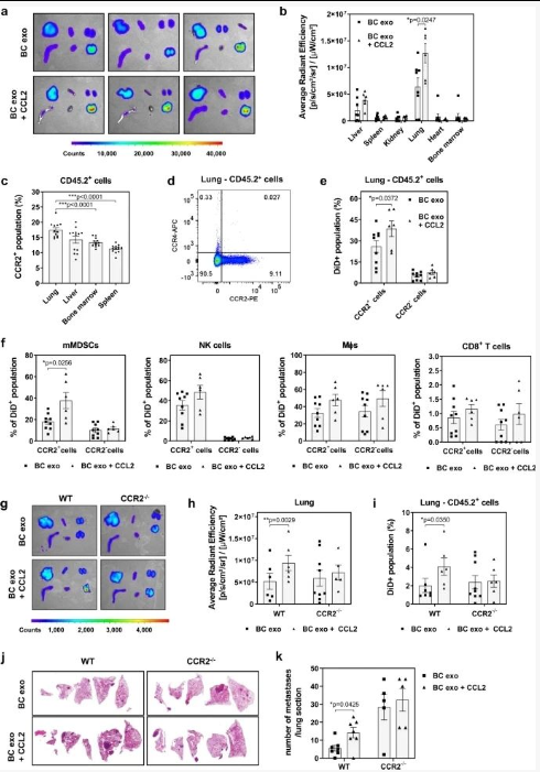 3、CCL2 结合的 BC 外泌体对器官分布、肺积聚或肺 CD45没有影响CCR2 -/-小鼠中的CCR2 +细胞摄取;