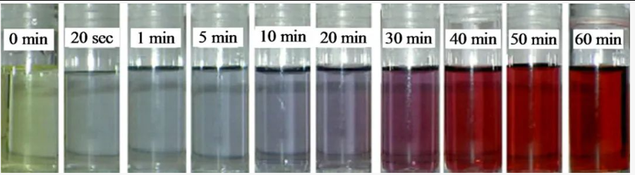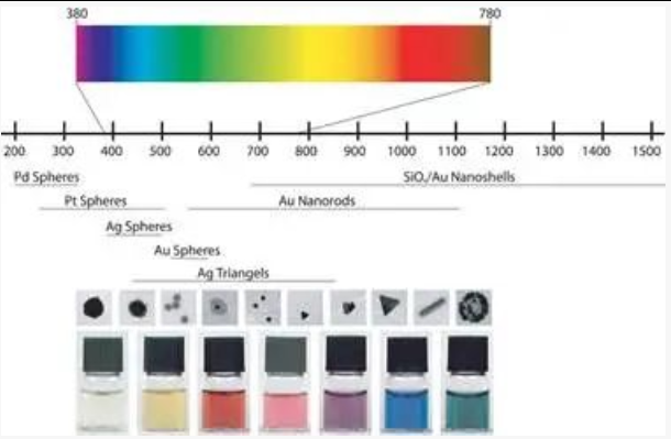 胶体金颜色会受到金纳米颗粒的大小的影响,随着金纳米颗粒大小的变大,它的最大吸收波长逐渐变大,外观颜色也从红色向紫色方向转移。下图中从左到右展示的是从4 nm到40 nm大小的金纳米颗粒颜色的变化[9]。从LSPR的原理上来说,金纳米颗粒越大,其表面电子距离核心的距离也就越远,变得更加容易发生震荡。震荡所需的能量越小,与入射光发生共振的光的频率也就越低,入射光发生共振的光波长也就越大。