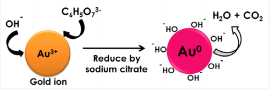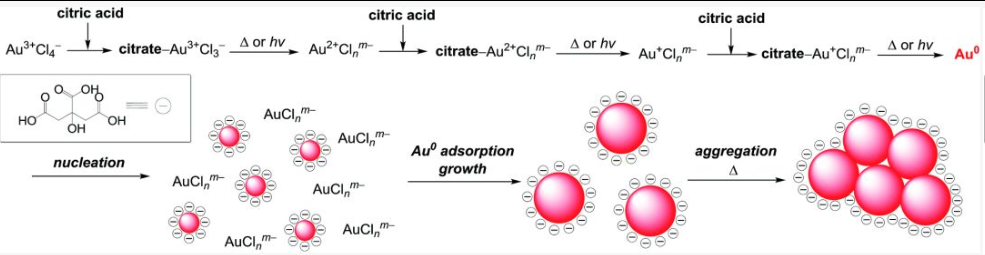 在这个过程中,三价的金离子被还原成零价的金原子,被称为Au Seed,我这里翻译成种子金。种子金的作用就像人工降雨里的碘化银凝结核,所不同的是,碘化银吸收的是水,而种子金吸收的是未进行还原的的柠檬酸分子[2]。