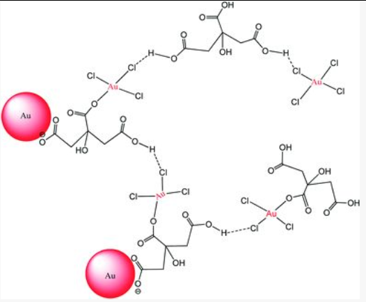 柠檬酸分子上的羧酸电离后带有负电,除了能与种子金形成化学键,还可以与未被还原的氯金酸中的金原子形成化学键[3]。