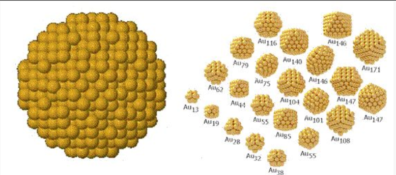 下图左侧的照片的展示要更直观一些,所谓的胶体金并非是单独的一个金原子,而是由多个金原子以及柠檬酸的聚合物。这些金原子颗粒的数量肉眼看过去也比较舒适,不至于产生密集恐惧症。除了球状的的金纳米颗粒,金纳米颗粒也可能形成下图右侧中的形状。这些形状是计算机模拟不同金原子数量的金纳米颗粒的结果[5],不少看起来像是魔方或是骰子,甚至可以联想为桑葚,大概小编已经饿了。