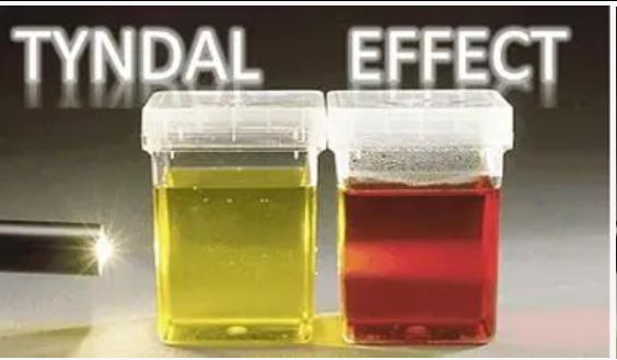 完成了上述胶体金的制备过程,怎么样去判断已经得到了成功的胶体金呢,有下面两种方案。第一种办法比较简便,即通过丁达尔现象来进行观测。所谓丁达尔现象,是当一束光线透过胶体,从垂直入射光方向可以观察到胶体里出现的一条光亮的“通路”。这是由于光在金纳米颗粒的表面发生散射的结果,而在黄色的氯金酸溶液中,由于氯金酸颗粒较小,散射作用较弱,不容易被观察到。